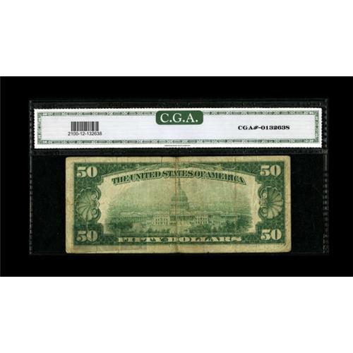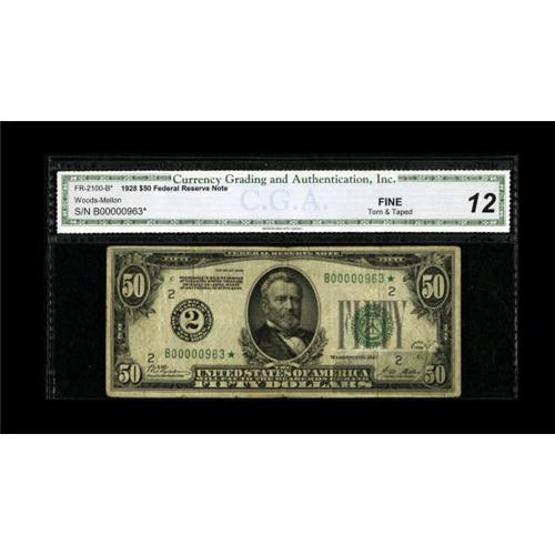 <B>Fr. 2100-B* $50 1928 Federal Reserve Note. CGA Fine 12.</B></I><BR> CGA has commented that this replacement note has been torn and taped. It is currently the lowest serial number known in the Schwartz/Lindquist guide.<BR><BR><b>Shipping:</b> Coins & Currency (<a target="_blank" href="http://www.heritageauctions.com/common/shipping.php">view shipping information</a>)