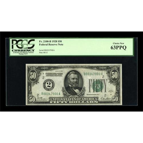 <B>Fr. 2100-B $50 1928 Federal Reserve Note. PCGS Choice New 63PPQ.</B></I><BR> A bright and original example which is perfect for type. <BR><I>From The Thomas M. Flynn Collection</B></I><BR><BR><b>Shipping:</b> Coins & Currency (<a target="_blank" href="http://www.heritageauctions.com/common/shipping.php">view shipping information</a>)