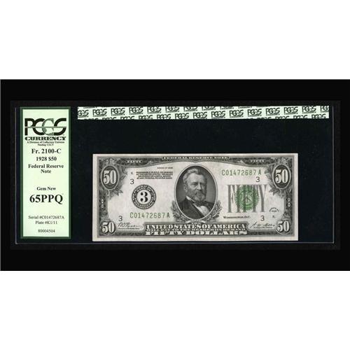 <B>Fr. 2100-C $50 1928 Federal Reserve Note. PCGS Gem New 65 PPQ.</B></I><BR>A PCGS Gem New 65 PPQ example from this much in demand series.