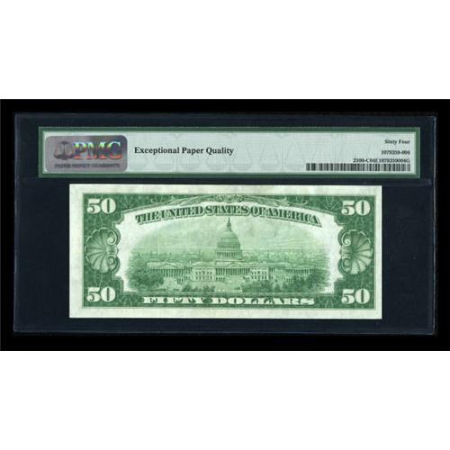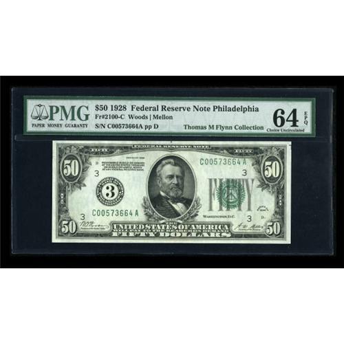 <B>Fr. 2100-C $50 1928 Federal Reserve Note. PMG Choice Uncirculated 64 EPQ.</B></I><BR> A bright and fully original example from a somewhat tougher district in this well collected series. <BR><I>From The Thomas M. Flynn Collection</B></I><BR><BR><b>Shipping:</b> Coins & Currency (<a target="_blank" href="http://www.heritageauctions.com/common/shipping.php">view shipping information</a>)