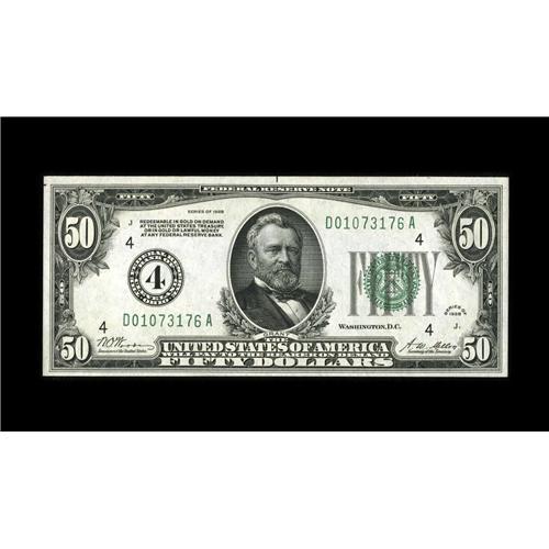 <B>Fr. 2100-D $50 1928 Federal Reserve Note. Crisp Uncirculated.</B></I><BR>This is a bright, colorful example which exhibits a touch of flatness.<BR><BR><b>Shipping:</b> Coin/Currency (<a target="_blank" href="http://www.heritageauctions.com/common/shipping.php">view shipping information</a>)