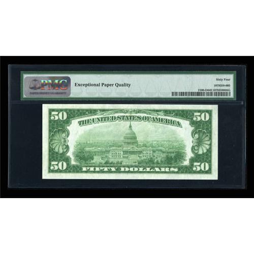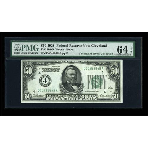 <B>Fr. 2100-D $50 1928 Federal Reserve Note. PMG Choice Uncirculated 64 EPQ.</B></I><BR> The back centering is perfect on this Series 1928 example, but the face is centered just a bit high for the full Gem grade. <BR><I>From The Thomas M. Flynn Collection</B></I><BR><BR><b>Shipping:</b> Coins & Currency (<a target="_blank" href="http://www.heritageauctions.com/common/shipping.php">view shipping information</a>)