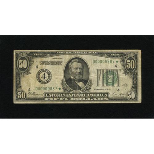 <B>Fr. 2100-D* $50 1928 Federal Reserve Note. Very Good-Fine.</B></I><BR> Serial number 9887* adorns this Star that has the district number within the district seal. This is only the third appearance of this elusive replacement in our auctions.<BR><BR><b>Shipping:</b> Coins & Currency (<a target="_blank" href="http://www.heritageauctions.com/common/shipping.php">view shipping information</a>)