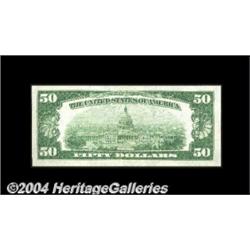 Fr. 2100-E $50 1928 Federal Reserve Note. Very Choice Crisp Uncirculated.Bright, flashy, and with traces of original embossing. A perfect Gem but for very minor centering imperfections. <BR><BR><B>Important notice:</B> Heritage usually auctions material at the rate of 200-250 lots per hour. On some occasions eBay Live bid software or the Internet may not be able to keep up with the pace of the auction. We recommend placing a realistic absentee bid now as insurance to avoid disappointment. Occasionally the auctioneer may eliminate or reject an eBay Live bid, and the auctioneer may also reopen a lot after the close of the eBay live bidding (usually because we missed an audience bid), and may reject your bid even if it shows you as the winning bidder. By bidding via eBay Live, you agree that Heritage may award the lot to another bidder at its sole discretion under the circumstances described above or any other reasonable circumstances. Since eBay bids are not shown to us until we open the lot on the floor, we treat those bids just like floor bids. In most cases the floor responds before the eBay bid is presented to us, due to Internet lag time, so for consistency we have made it a policy that floor bids are always considered first over tie eBay live bids. Also please note that all Heritage lots purchased through eBay Live carry a 20% Buyer's Premium. Please make sure you read the Terms and Conditions before you bid. <BR><BR><B>IMPORTANT ANNOUNCEMENT ABOUT RESERVES:</B> Heritage now divulges all reserves on its web site 7 days before every auction. If you want to know whether the reserve on this lot has been met, and if not, what the reserve amount is, please visit this lot page on the HeritageCoin.com web site, or email: bid@HeritageGalleries.com