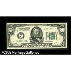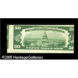 <B>Fr. 2100-G $50 1928 Federal Reserve Note. Extremely Fine.</B></I> Errors are seldom seen on early $50 FRNs, with this example showing a portion of an adjacent note along its back left-hand edge. Lot:15397