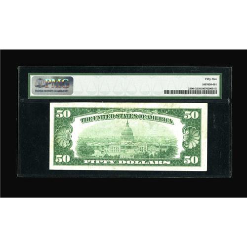 <B>Fr. 2100-G $50 1928 Federal Reserve Note. PMG About Uncirculated 55.</B></I><BR>Some minor handling is noted through the holder and is responsible for the grade. This note likely never entered circulation, rather sat in an original pack and held for cash reserves by a bank in the Midwest.<BR><BR><b>Shipping:</b> Coins & Currency (<a target="_blank" href="http://www.heritageauctions.com/common/shipping.php">view shipping information</a>)
