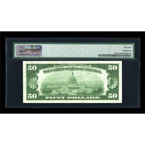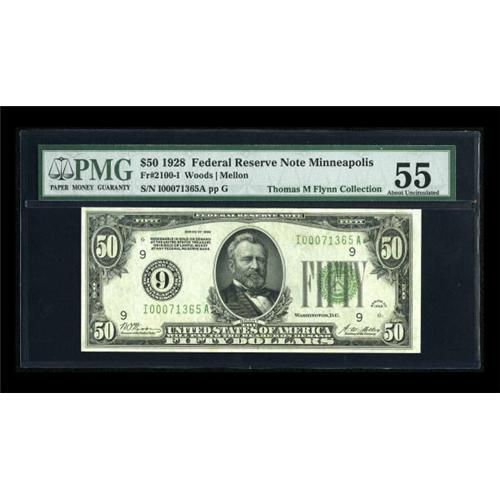 <B>Fr. 2100-I $50 1928 Federal Reserve Note. PMG About Uncirculated 55.</B></I><BR> This is one of the hardest to obtain districts in this series, and the one with the lowest print run in this denomination. PMG has only graded four pieces to date, none of which have been uncirculated. This is the finest example that Tom could obtain during his many years of collecting. <BR><I>From The Thomas M. Flynn Collection</B></I><BR><BR><b>Shipping:</b> Coins & Currency (<a target="_blank" href="http://www.heritageauctions.com/common/shipping.php">view shipping information</a>)