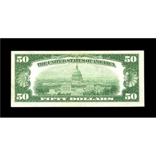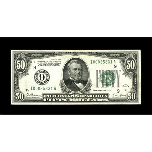 <B>Fr. 2100-I $50 1928 Federal Reserve Note. Very Fine-Extremely Fine.</B></I><BR>This example comes from the lowest printed district for the series. This is just the second example we have auctioned in over five years. Bright colors are, but a small repair that affects little is noticed at left.<BR><BR><b>Shipping:</b> Coin/Currency (<a target="_blank" href="http://www.heritageauctions.com/common/shipping.php">view shipping information</a>)