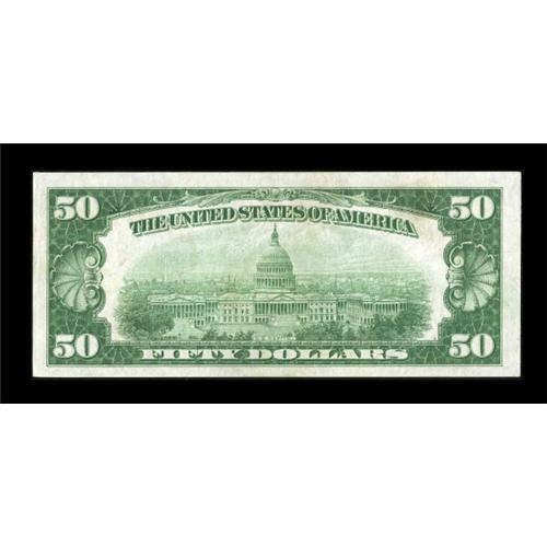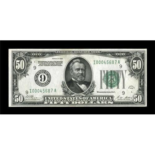 <B>Fr. 2100-I $50 1928 Federal Reserve Note. Extremely Fine-About Uncirculated.</B></I><BR> Light handling is noticed throughout on this Minneapolis example which is quite elusive in the higher grades.<BR><BR><b>Shipping:</b> Coins & Currency (<a target="_blank" href="http://www.heritageauctions.com/common/shipping.php">view shipping information</a>)