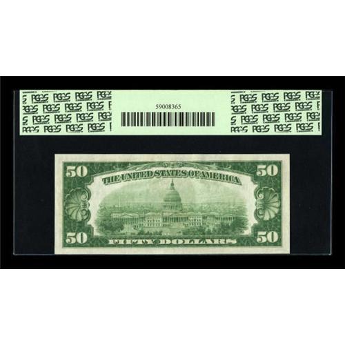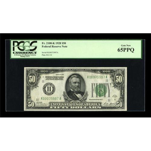 <B>Fr. 2100-K $50 1928 Federal Reserve Note. PCGS Gem New 65PPQ.</B></I><BR> Dallas and Minneapolis are the key districts in the 1928 fifties, particularly in the highest grade ranges. Dallas notes are priced at $2000 in Choice CU in the new Schwartz & Lindquist catalogue, and unpriced in Gem. Here, from the Flynn collection, is an opportunity to obtain a PCGS graded Gem, with the PPQ designation testifying to the note's originality. <BR><I>From The Thomas M. Flynn Collection</B></I><BR><BR><b>Shipping:</b> Coins & Currency (<a target="_blank" href="http://www.heritageauctions.com/common/shipping.php">view shipping information</a>)
