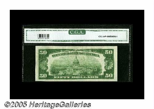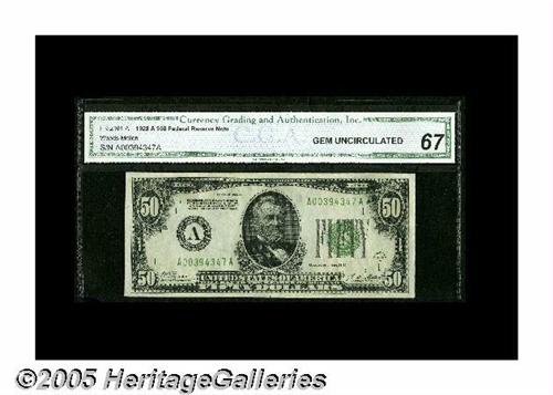 <B>Fr. 2101-A $50 1928A Federal Reserve Note. CGA Gem Uncirculated 67.</B></I><BR>A real beauty with stunning boardwalk margins from this still underpriced early FRN series.