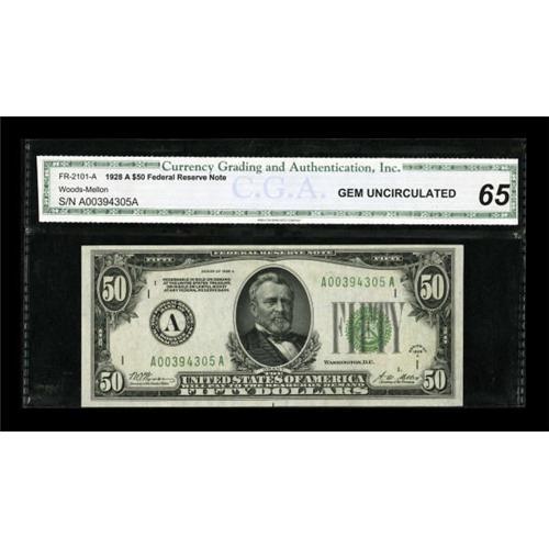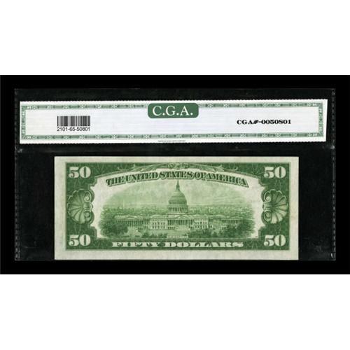 <B>Fr. 2101-A $50 1928A Federal Reserve Note. CGA Gem Uncirculated 65.</B></I><BR> This example hails from an elusive district for higher end notes.<BR><BR><b>Shipping:</b> Coins & Currency (<a target="_blank" href="http://www.heritageauctions.com/common/shipping.php">view shipping information</a>)