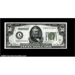 Fr. 2101-A $50 1928A Federal Reserve Note. Gem Crisp Uncirculated.A second example from this seldom offered district. The new Oakes catalogue value in CU condition is $425. Important notice: We expect to be auctioning lots at the rate of 200-250 per hour. Sometimes eBay Premier live bid software cannot keep up with that pace, so we strongly recommend that you place a realistic proxy bid now as insurance to avoid disappointment. Also please note that all Heritage/CAA lots purchased through eBay Premier carry a 20% Buyer's Premium. Please make sure you read the Terms and Conditions.
