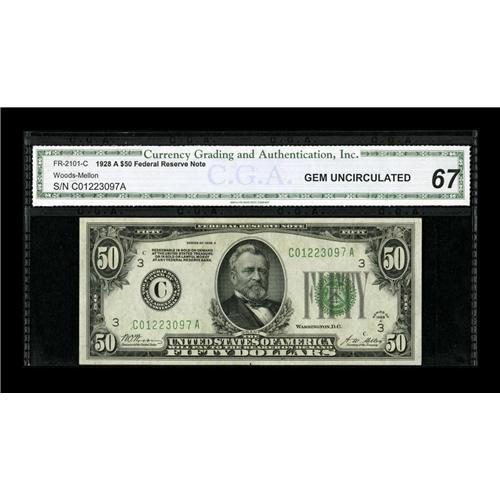<B>Fr. 2101-C $50 1928A Federal Reserve Note. CGA Gem Uncirculated 67.</B></I><BR>Another high grade example of this early type that is difficult to find in such a high state of preservation.<BR><BR><b>Shipping:</b> Coin/Currency (<a target="_blank" href="http://www.heritageauctions.com/common/shipping.php">view shipping information</a>)