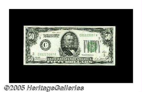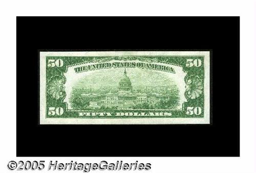 <B>Fr. 2101-C $50 1928A Federal Reserve Note. Choice Crisp Uncirculated.</B></I><BR>Dark inks inhabit this nicely margined $50 that has a trivial skin dot just inside the bottom frame line.