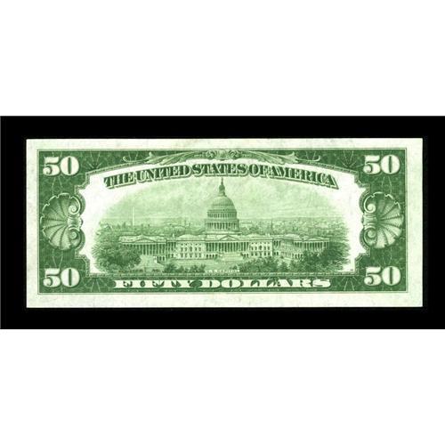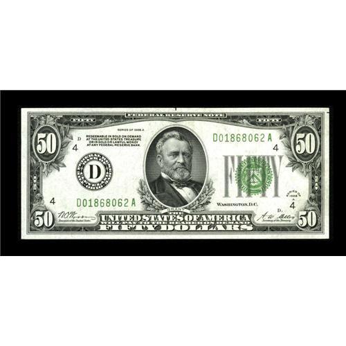 <B>Fr. 2101-D $50 1928A Federal Reserve Note. Choice Crisp Uncirculated.</B></I><BR>The first of a small group of these notes, all bright and new but not up to the gem standard.<BR><BR><b>Shipping:</b> Coins & Currency (<a target="_blank" href="http://www.heritageauctions.com/common/shipping.php">view shipping information</a>)