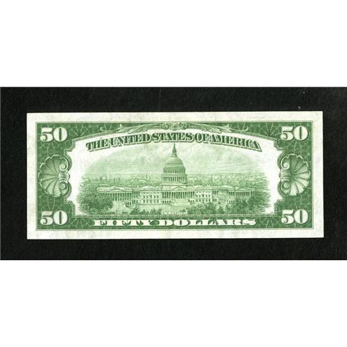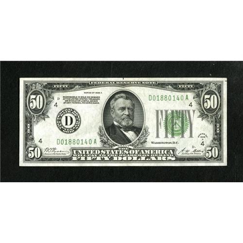 <B>Fr. 2101-D $50 1928A Federal Reserve Note. Crisp Uncirculated.</B></I><BR>This well margined issue shows a touch of handling and great eye appeal.<BR><BR><b>Shipping:</b> Coins & Currency (<a target="_blank" href="http://www.heritageauctions.com/common/shipping.php">view shipping information</a>)