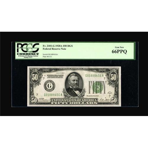 <B>Fr. 2101-G $50 1928A Federal Reserve Note. PCGS Gem New 66PPQ.</B></I><BR> This gorgeous example has wide, even margins and breathtaking, original surfaces. <BR><BR><b>Shipping:</b> Coins & Currency (<a target="_blank" href="http://www.heritageauctions.com/common/shipping.php">view shipping information</a>)