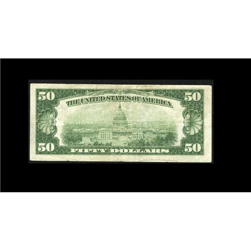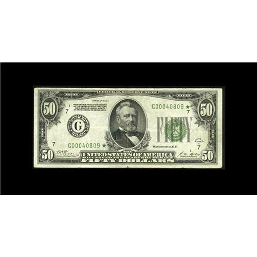 <B>Fr. 2101-G* $50 1928A Federal Reserve Note. Very Fine.</B></I><BR>The pleasure is truly ours to help another collector add an important replacement note to their collection. Until the Taylor Family Collection sale in February of 2005 this issue was not known. This note should generate some interest as the surfaces remain quite crisp and the overall color bright. A few pinholes seen near the left edge do not affect the overall eye appeal of this piece. Three notes now round out the meager population of this rare star and they continue to be a prime focal point of collector interest. Expect this item to realize somewhere in the area of...