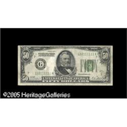 <B>Fr. 2101-G $50 1928A Inverted Reverse Federal Reserve Note Fine.</B></I> An extremely rare denomination for early inverts, with this series and denomination missing from even the major collection of inverted reverse examples we offered several years ago. The serial number is a near solid, which may account for this note's survival. Both blue and purple bank stamps have been partially removed to the left of the portrait, leaving small scuffed white areas. Lot:15066