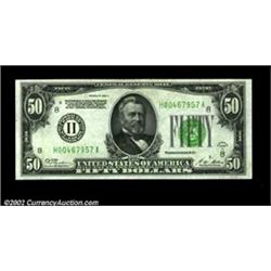 Fr. 2101-H $50 1928A Federal Reserve Note. Gem Crisp Uncirculated.A well embossed and nicely centered example which catalogues at $500 in the new Oakes catalogue. Important notice: We expect to be auctioning lots at the rate of 200-250 per hour. Sometimes eBay Premier live bid software cannot keep up with that pace, so we strongly recommend that you place a realistic proxy bid now as insurance to avoid disappointment. Also please note that all Heritage/CAA lots purchased through eBay Premier carry a 20% Buyer's Premium. Please make sure you read the Terms and Conditions.
