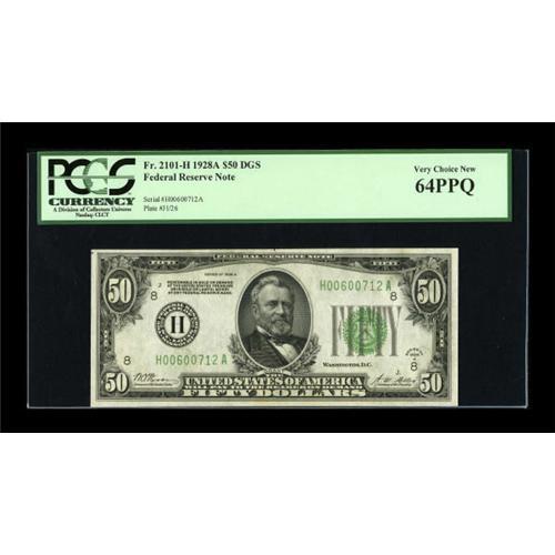<B>Fr. 2101-H $50 1928A Federal Reserve Note. PCGS Very Choice New 64PPQ.</B></I><BR> Deep original embossing of the dark green overprint can be seen through the holder.<BR><BR><b>Shipping:</b> Coins & Currency (<a target="_blank" href="http://www.heritageauctions.com/common/shipping.php">view shipping information</a>)