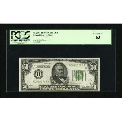 <B>Fr. 2101-H $50 1928A Federal Reserve Note. PCGS Choice New 63.</B></I><BR> The upper serial number and the Treasury Seal exhibit embossing.<BR><BR><b>Shipping:</b> Coins & Currency (<a target="_blank" href="http://www.heritageauctions.com/common/shipping.php">view shipping information</a>)