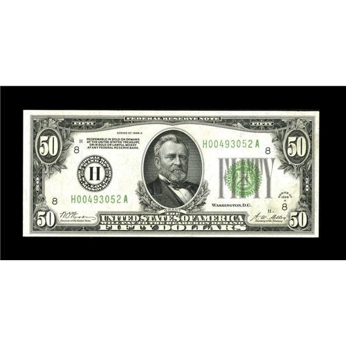 <B>Fr. 2101-H $50 1928A Federal Reserve Note. Very Choice Crisp Uncirculated.</B></I><BR>A fresh and brightly colored example of this very tough note which catalogues for $500 in CU.<BR><BR><b>Shipping:</b> Coins & Currency (<a target="_blank" href="http://www.heritageauctions.com/common/shipping.php">view shipping information</a>)