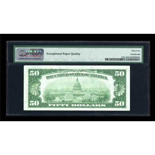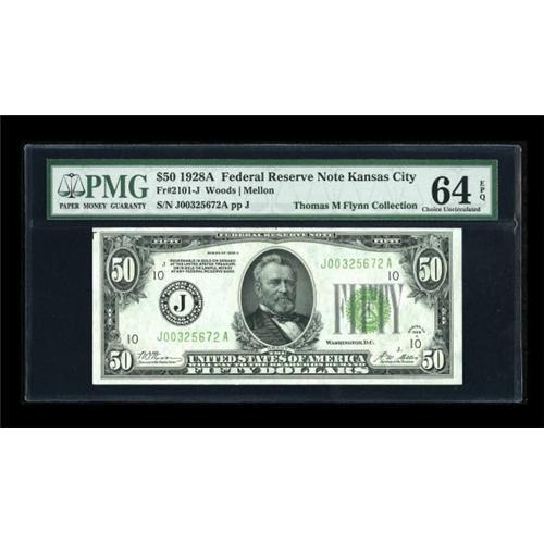 <B>Fr. 2101-J $50 1928A Federal Reserve Note. PMG Choice Uncirculated 64 EPQ.</B></I><BR> A tough series to obtain notes in this grade, save for the St. Louis district. This is the only Kansas City district example graded to date by PMG. <BR><I>From The Thomas M. Flynn Collection</B></I><BR><BR><b>Shipping:</b> Coins & Currency (<a target="_blank" href="http://www.heritageauctions.com/common/shipping.php">view shipping information</a>)