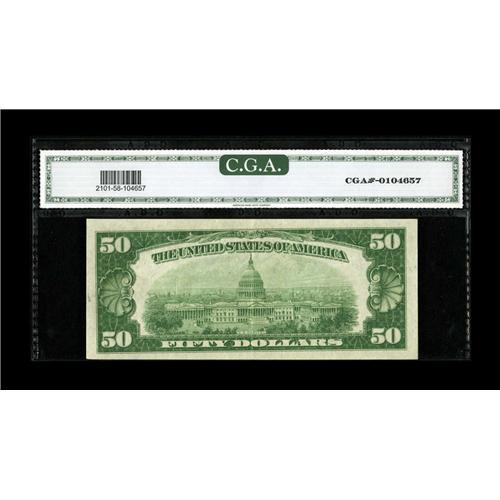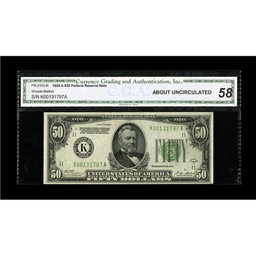 <B>Fr. 2101-K $50 1928A Federal Reserve Note. CGA About Uncirculated 58.</B></I><BR>A center bend may be the only grade limiting factor on this note. Few examples survived in uncirculated condition, explaining the $800 catalog value for Uncirculated issues.<BR><BR><b>Shipping:</b> Coin/Currency (<a target="_blank" href="http://www.heritageauctions.com/common/shipping.php">view shipping information</a>)