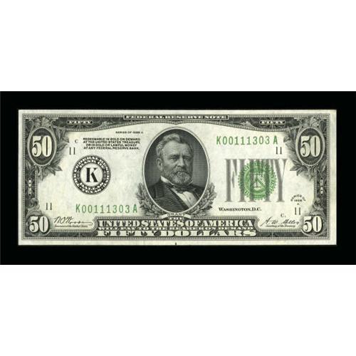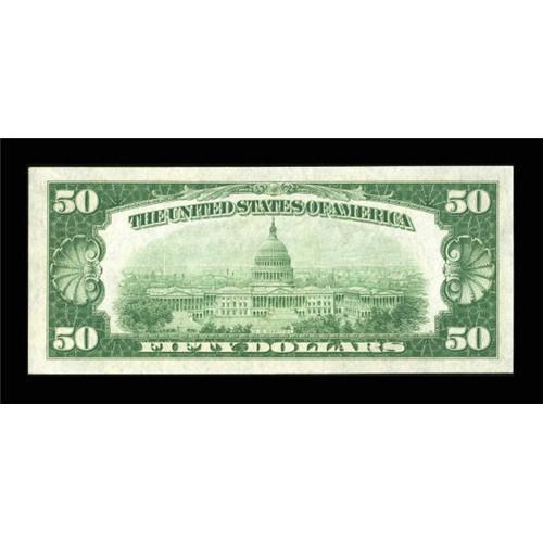 <B>Fr. 2101-K $50 1928A Federal Reserve Note. Choice Crisp Uncirculated.</B></I><BR> A bright and very attractive Dallas example. This is the key district in this series, and a note very seldom available in this grade. <BR><BR><b>Shipping:</b> Coins & Currency (<a target="_blank" href="http://www.heritageauctions.com/common/shipping.php">view shipping information</a>)