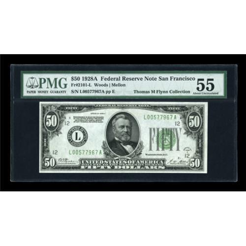 <B>Fr. 2101-L $50 1928A Federal Reserve Note. PMG About Uncirculated 55.</B></I><BR> A high grade piece from a much scarcer district. <BR><I>From The Thomas M. Flynn Collection</B></I><BR><BR><b>Shipping:</b> Coins & Currency (<a target="_blank" href="http://www.heritageauctions.com/common/shipping.php">view shipping information</a>)