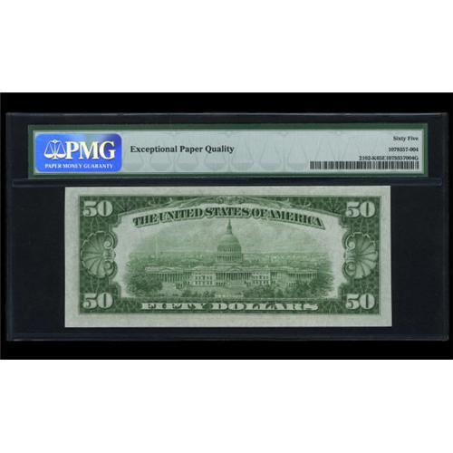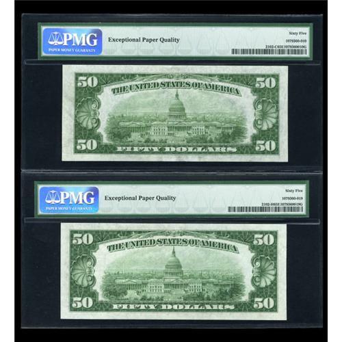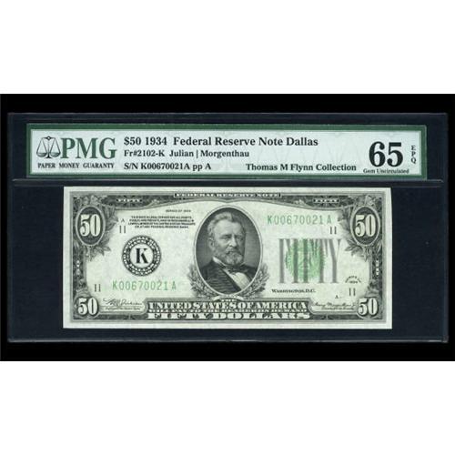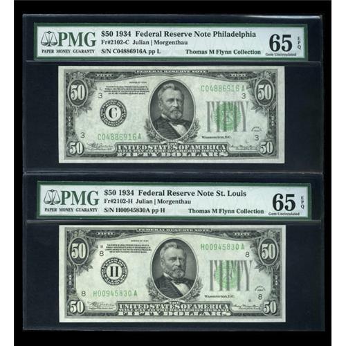 <B>Fr. 2102-C $50 1934 Federal Reserve Note. PMG Gem Uncirculated 65 EPQ.<BR>Fr. 2102-H $50 1934 Federal Reserve Note. PMG Gem Uncirculated 65 EPQ.<BR>Fr. 2102-K $50 1934 Federal Reserve Note. PMG Gem Uncirculated 65 EPQ.</B></I><BR> Three pieces, all well centered gems with the EPQ designation.<BR><I>From The Thomas M. Flynn Collection</B></I><BR><BR><b>Shipping:</b> Coins & Currency (<a target="_blank" href="http://www.heritageauctions.com/common/shipping.php">view shipping information</a>)