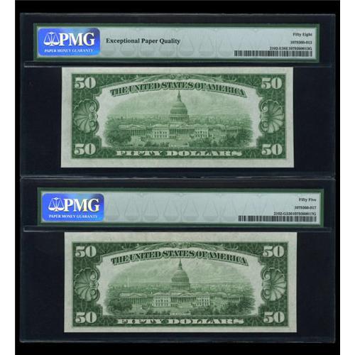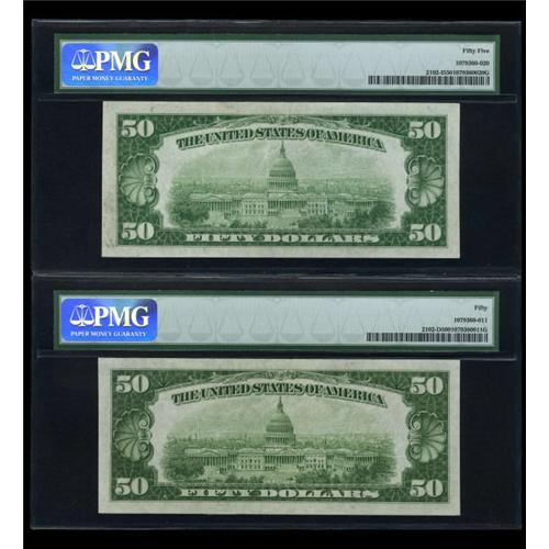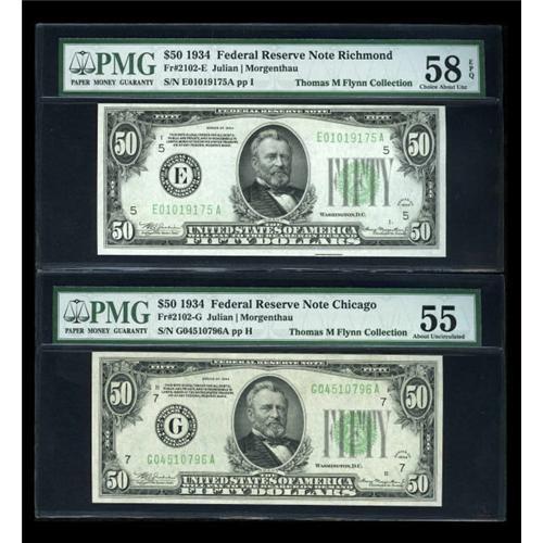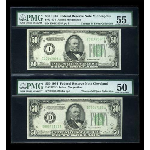 <B>Fr. 2102-D $50 1934 Federal Reserve Note. PMG About Unc 50<BR>Fr. 2102-E $50 1934 Federal Reserve Note. PMG About Unc 58 EPQ<BR>Fr. 2102-G $50 1934 Federal Reserve Note. PMG About Unc 55<BR>Fr. 2102-I $50 1934 Federal Reserve Note. PMG About Unc 55</B></I><BR> A quartet of high grade 1934 fifties.<BR><I>From The Thomas M. Flynn Collection</B></I><BR><BR><b>Shipping:</b> Coins & Currency (<a target="_blank" href="http://www.heritageauctions.com/common/shipping.php">view shipping information</a>)