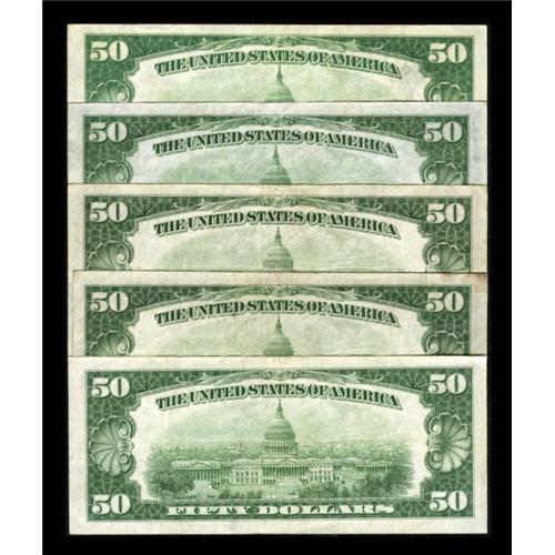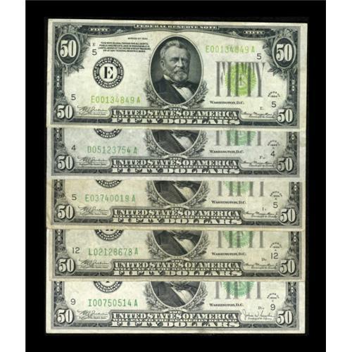 <B>Fr. 2102-E $50 1934 LGS Federal Reserve Note. VF<BR>Fr. 2103-D,E,L $50 1934A Federal Reserve Notes. VF<BR>Fr. 2105-I $50 1934C Federal Reserve Note. VF.</B></I><BR> These are all nice mid-grade notes.<BR><I>From The Thomas M. Flynn Collection</B></I><BR><BR><b>Shipping:</b> Coins & Currency (<a target="_blank" href="http://www.heritageauctions.com/common/shipping.php">view shipping information</a>)