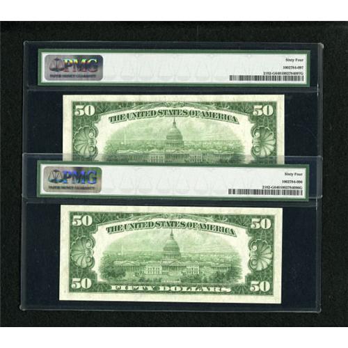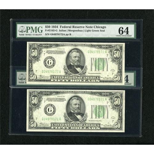 <B>Fr. 2102-G $50 1934 Federal Reserve Notes. Two Consecutive Examples PMG Choice Uncirculated 64.</B></I><BR> This is a pleasing pair of original well embossed notes misattributed as Light Green Seals.<BR><BR><b>Shipping:</b> Coins & Currency (<a target="_blank" href="http://www.heritageauctions.com/common/shipping.php">view shipping information</a>)