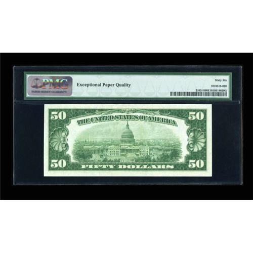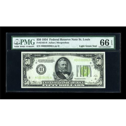 <B>Fr. 2102-H $50 1934 Light Green Seal Federal Reserve Note. PMG Gem Uncirculated 66 EPQ.</B></I><BR> The inks are bright and the note displays excellent eye appeal.<BR><BR><b>Shipping:</b> Coins & Currency (<a target="_blank" href="http://www.heritageauctions.com/common/shipping.php">view shipping information</a>)