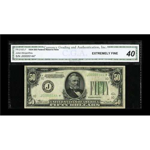 <B>Fr. 2102-J* $50 1934 Federal Reserve Note. CGA Extremely Fine 40.</B></I><BR>This replacement exhibits even circulation.<BR><BR><b>Shipping:</b> Coins & Currency (<a target="_blank" href="http://www.heritageauctions.com/common/shipping.php">view shipping information</a>)