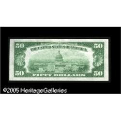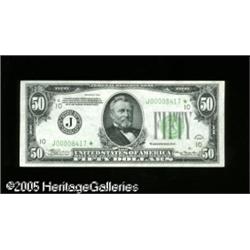 <B>Fr. 2102-J* $50 1934 Federal Reserve Note. Crisp Uncirculated.</B></I><BR>Well centered and very fresh, but with just a bit too much handling to merit the Choice designation. Lot:16222