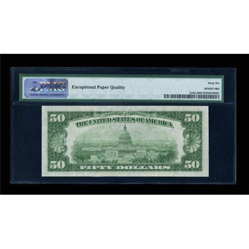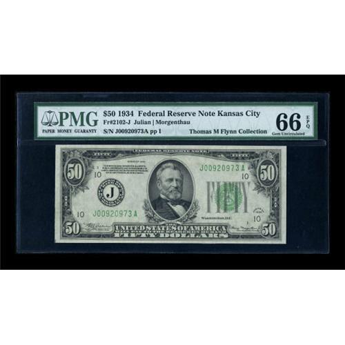<B>Fr. 2102-J $50 1934 Federal Reserve Note. PMG Gem Uncirculated 66 EPQ.</B></I><BR> A beautifully centered piece that well deserves its 66 EPQ grade.<BR><I>From The Thomas M. Flynn Collection</B></I><BR><BR><b>Shipping:</b> Coins & Currency (<a target="_blank" href="http://www.heritageauctions.com/common/shipping.php">view shipping information</a>)