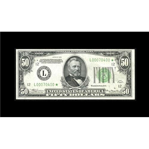 <B>Fr. 2102-L* $50 1934 Federal Reserve Note. Gem Crisp Uncirculated.</B></I><BR>A nice early star note with great color and originality. Expect the Oakes catalogue valuation of $1000 in CU to prove quite conservative here.