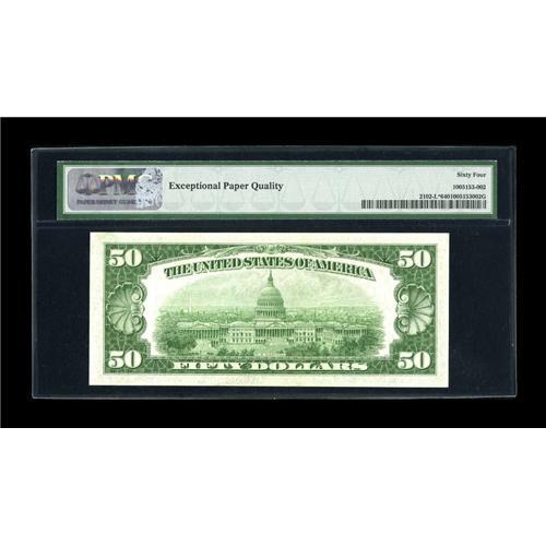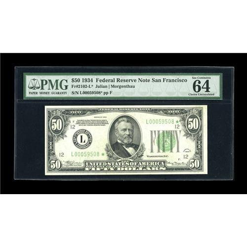 <B>Fr. 2102-L* $50 1934 Federal Reserve Note. PMG Choice Uncirculated 64 EPQ.</B></I><BR>Original embossing of the seal is noted through the holder and the margins are sufficient for some to call this example a Gem.<BR><BR><b>Shipping:</b> Coins & Currency (<a target="_blank" href="http://www.heritageauctions.com/common/shipping.php">view shipping information</a>)