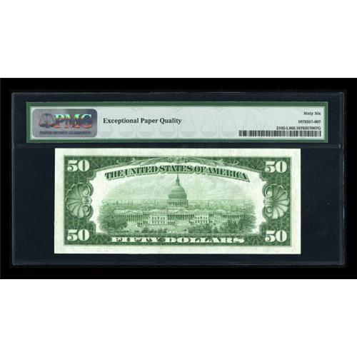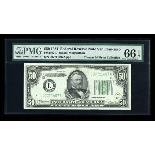 <B>Fr. 2102-L $50 1934 Federal Reserve Note. PMG Gem Uncirculated 66 EPQ.</B></I><BR> An exceptionally bright note from a series where even the highest grade examples often have a somewhat dingy appearance. Not this one...it is just about perfect in every respect. <BR><I>From The Thomas M. Flynn Collection</B></I><BR><BR><b>Shipping:</b> Coins & Currency (<a target="_blank" href="http://www.heritageauctions.com/common/shipping.php">view shipping information</a>)