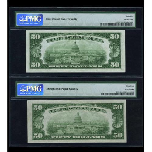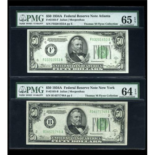 <B>Fr. 2103-B $50 1934A Federal Reserve Note. PMG Choice Uncirculated 64 EPQ; Fr. 2103-F $50 1934A Federal Reserve Note. PMG Gem Uncirculated 65EPQ.</B></I><BR> Embossing and natural paper wave are clearly visible through the third party holders on this pretty pair of early $50 Feds. It is easy to see why they earned the "EPQ" designation from PMG.<BR><I>From The Thomas M. Flynn Collection</B></I><BR><BR><b>Shipping:</b> Coins & Currency (<a target="_blank" href="http://www.heritageauctions.com/common/shipping.php">view shipping information</a>)