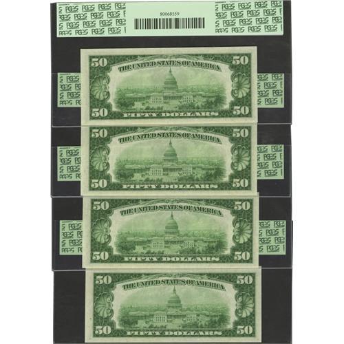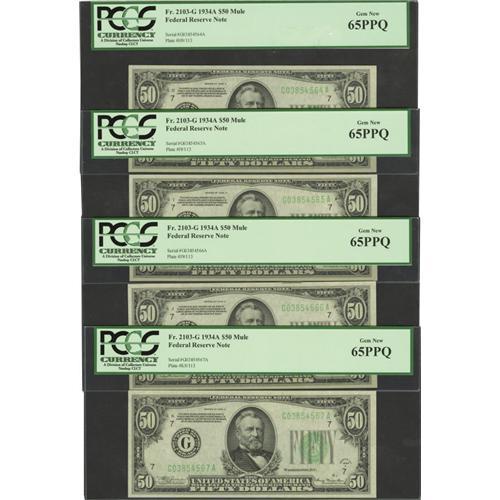 <B>Fr. 2103-G $50 1934A Federal Reserve Notes. Four Consecutive Examples. PCGS Gem New 65PPQ</B></I>.<B></B></I><BR> Excellent centering and fresh inks are mainstays of these notes from a bygone era.<BR><BR><b>Shipping:</b> Coins & Currency (<a target="_blank" href="http://www.heritageauctions.com/common/shipping.php">view shipping information</a>)