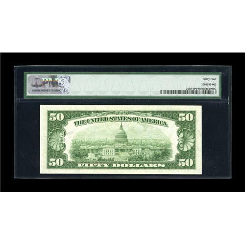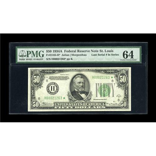 <B>Fr. 2103-H* $50 1934A Federal Reserve Note. PMG Choice Uncirculated 64.</B></I><BR>This is a very scarce series for stars, with examples in this grade range almost never available. In fact, this is the only example that we have handled. It was previously offered as part of the Taylor Family Collection in 2005 where it realized just shy of $3,000. We expect that price may prove conservative in today's market.<BR><BR><b>Shipping:</b> Coins & Currency (<a target="_blank" href="http://www.heritageauctions.com/common/shipping.php">view shipping information</a>)