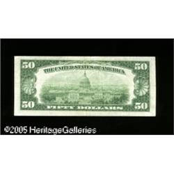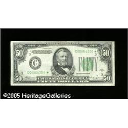 <B>Fr. 2104-C* $50 1934B Federal Reserve Note. Very Fine-Extremely Fine.</B></I><BR>This is one of the very rarest series for star examples, with only four of the ten issuing districts reported in the Oakes reference. While circulated, this is a most attractive piece which will fit nicely into even the finest of collections. Expect the Oakes catalogue valuation of $1100 in Very Fine to be blown away early in the bidding. Lot:16232