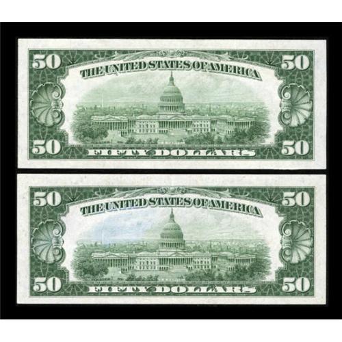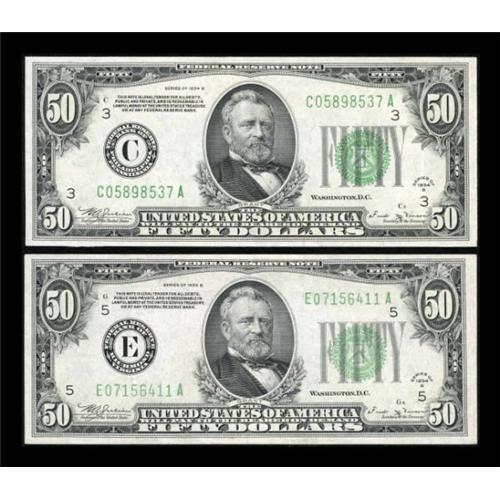 <B>Fr. 2104-C; E $50 1934B Federal Reserve Notes. Choice Crisp Uncirculated.</B></I><BR> The Richmond note's back has a faint blue color to the left of the Capitol Building.<BR><I>From The Thomas M. Flynn Collection</B></I><BR><BR><b>Shipping:</b> Coins & Currency (<a target="_blank" href="http://www.heritageauctions.com/common/shipping.php">view shipping information</a>)