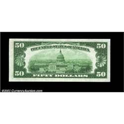 Fr. 2104-J $50 1934B Federal Reserve Note. Gem Crisp Uncirculated.Another very scarce series, especially when notes come this nice. The catalogue value again is $500. Important notice: We expect to be auctioning lots at the rate of 200-250 per hour. Sometimes eBay Premier live bid software cannot keep up with that pace, so we strongly recommend that you place a realistic proxy bid now as insurance to avoid disappointment. Also please note that all Heritage/CAA lots purchased through eBay Premier carry a 20% Buyer's Premium. Please make sure you read the Terms and Conditions.