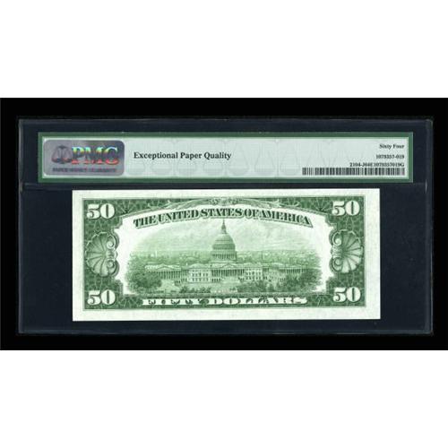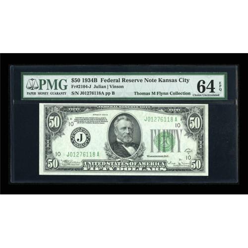 <B>Fr. 2104-J $50 1934B Federal Reserve Note. PMG Choice Uncirculated 64 EPQ.</B></I><BR> A nice example from this tougher series. <BR><I>From The Thomas M. Flynn Collection</B></I><BR><BR><b>Shipping:</b> Coins & Currency (<a target="_blank" href="http://www.heritageauctions.com/common/shipping.php">view shipping information</a>)